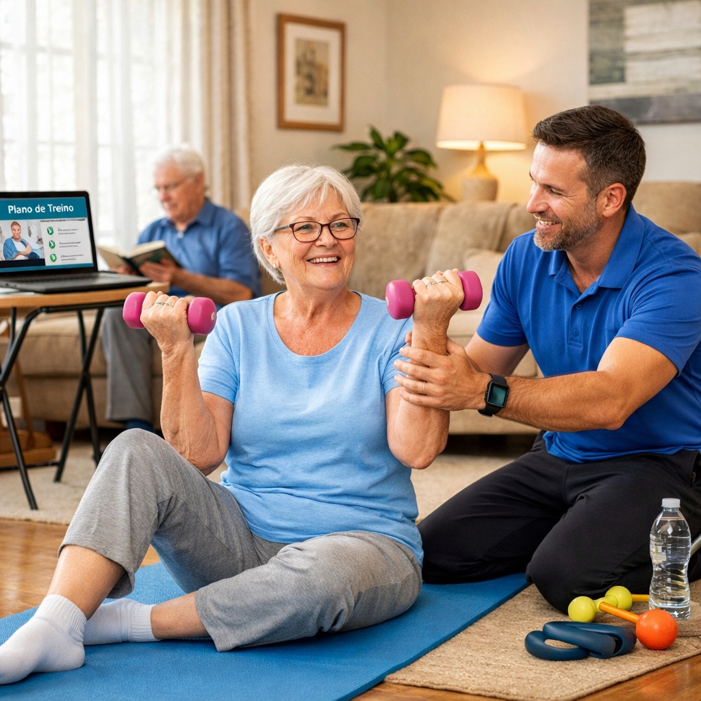 Programas de exercício físico personalizados, realizados no domicílio, com foco na mobilidade, equilíbrio, força e prevenção de quedas, adaptados à condição física de cada pessoa.